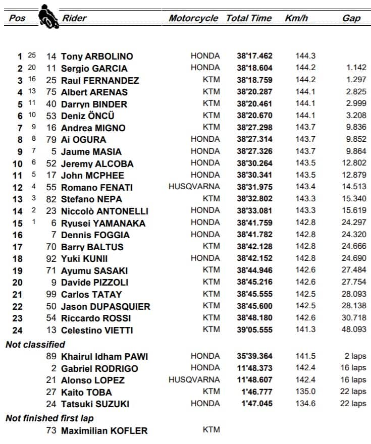 “C’ho messo solo del mio e adesso vado a Portimao a giocarmi il mondiale”, il primo commento a caldo di Arbolino che sulla strada si troverà comunque anche Ogura, arrivato ottavo dopo un difficile e spigoloso duello con Masia (che a tratti è sembrato quasi volerlo ostacolare) e Migno, settimo, che l’ha spuntata sugli altri due. Il giapponese scivola a 8 punti, ma l’ultima gara si preannuncia incandescente. Arenas ha già anticipato di gradire la pista portoghese dove ha anche fatto dei test a inizio anno. Esce dalla contesa invece Celestino Vietti, incappato nella seconda consecutiva giornata storta. Caduto al quarto giro, ripartito, ha chiuso ultimo.
