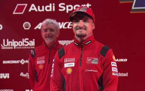 Uno scatto conclusivo, al termine dell'unveiling, con il team di Borgo Panigale presente sul palco: sono intervenuti nel corso dell'evento anche Gigi Dall'Igna (direttore generale Ducati Corse), Paolo Ciabatti (direttore sportivo di Ducati Corse) e Davide Tardozzi (team manager Ducati Corse)