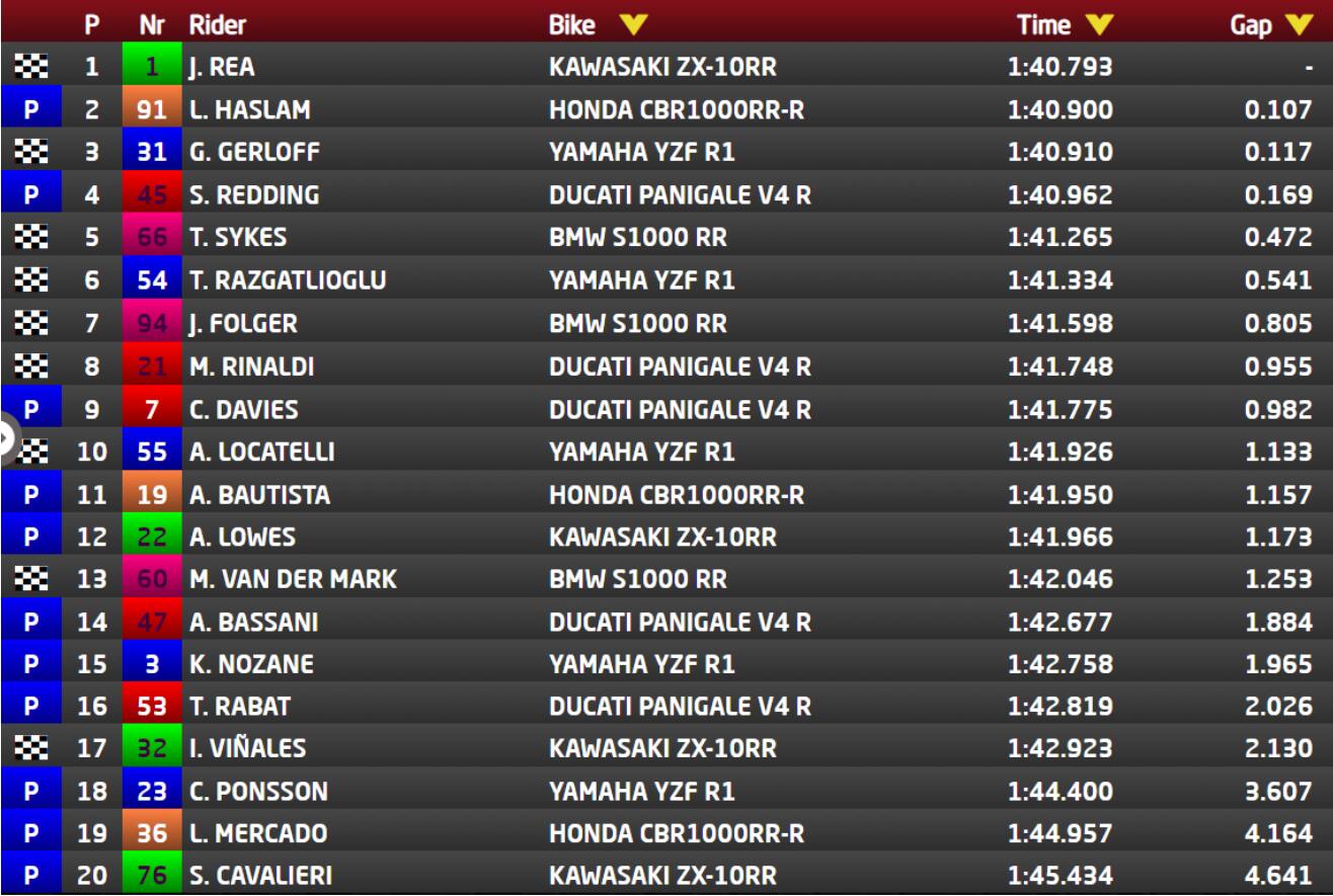 Lontano dai fasti del compagno di squadra Haslam, Alvaro Bautista si attesta in undicesima posizione davanti ad Alex Lowes e Michael van der Mark, con Axel Bassani quattordicesimo. Chiudono la classifica Kohta Nozane, Tito Rabat, Isaac Vinales, Christophe Ponsson, Leandro Mercado (annunciato ieri come primo pilota del team Honda MIE) e Samuele Cavalieri, alla prima presa di contatto con Kawasaki Pedercini.