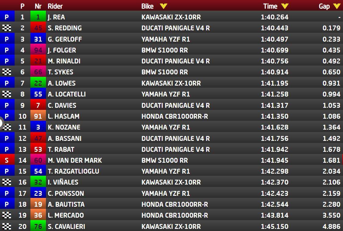 Quattordicesimo Michael van der Mark, protagonista di una violenta caduta a mezz’ora dalla fine: BMW distrutta, ma pilota illeso. Dietro di lui in classifica troviamo Toprak Razgatlioglu, con soli due giri all’attivo; il turco di casa Yamaha è risultato positivo al tampone anti-Covid ed è attualmente in isolamento. Chiudono la classifica Isaac Vinales (Kawasaki Orelac), Christophe Ponsson (Alstare Yamaha), Alvaro Bautista (dolorante per una caduta in allenamento e fermatosi dopo un solo giro), Leandro Mercado (MIE Honda) e Samuele Cavalieri (Kawasaki Pedercini).