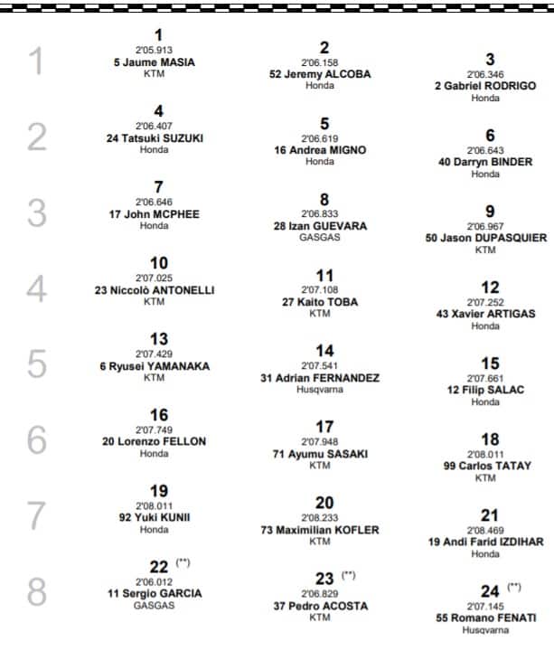 Guadagna quindi una posizione Alcoba, mentre Rodrigo risale in prima fila, davanti a Tatsu Suzuki che certifica il miglioramento del suo stato di salute. Migno aspirava a qualcosa di più, ma considerando come è andata la FP2 (è stato rallentato e quindi penalizzato dal gruppone di cui sopra) non se l’è cavata male. Il romagnolo ha passato indenne la Q1 e con un buon giro in Q2, in cui ha trovato la scia di Foggia, s’è preso la settima casella. Dalla Q1 sono usciti fuori anche Foggia, Artigas e lo svizzero Dupasquier. Binder entrato direttamente in Q2 non ha invece brillato. Il sudafricano è rimasto attardato per quasi tutto il turno, ha fatto un bel giro nel finale, offrendo però lui, questa volta, la scia a chi lo seguiva, che lo ha superato, come da manuale, sul lungo rettilineo di Losail.