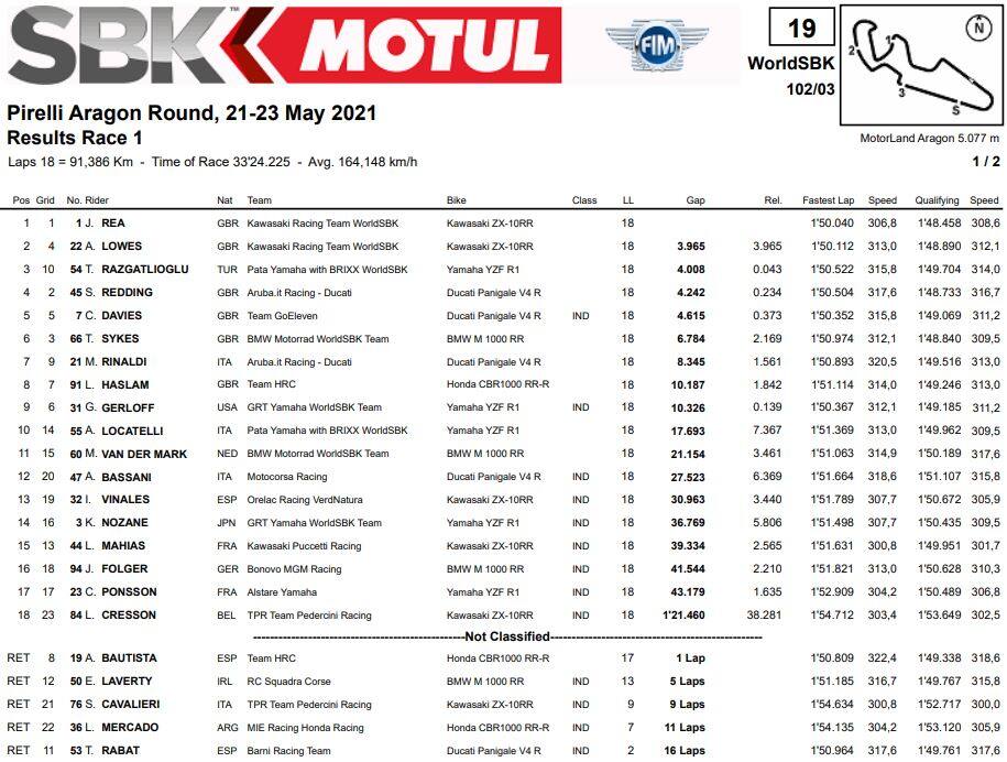 Ai piedi del podio le Ducati di Scott Redding e Chaz Davies, con Tom Sykes sesto a un paio di secondi dalle Panigale V4R. Michael Ruben Rinaldi porta a casa la settima posizione nella sua prima gara da pilota ufficiale Aruba Ducati, precedendo Leon Haslam e un Garrett Gerloff molto combattivo nelle prime fasi. Chiude la top-10 Andrea Locatelli, al debutto in Superbike con la R1 factory del team Pata Yamaha Brixx.