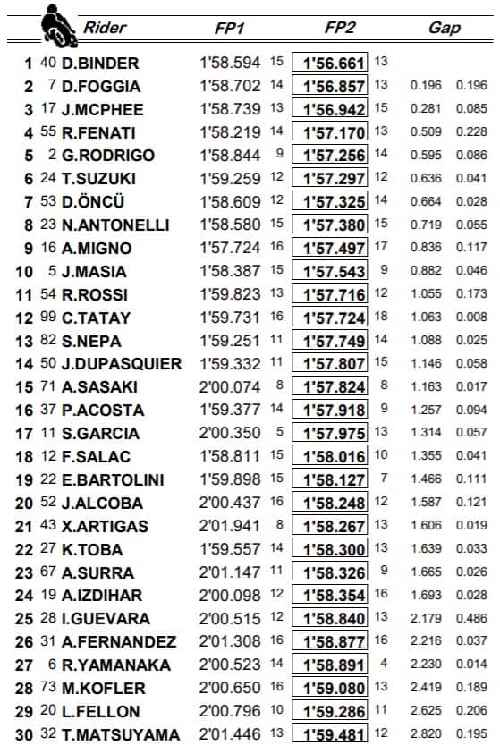All’appello manca Pedro Acosta, perché il “nino de oro” è caduto in FP2 alla Bucine e non è riuscito a tornare in pista. Al netto della ghiaia che si è portato dietro al box, il leader del Mondiale non sembrava granché preoccupato. Nelle top 14, ci sono anche Antonelli (8°), Rossi (11°) e Nepa (13°).