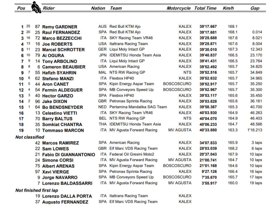 Alla fine, cinicamente, conta il risultato: “Quando ho visto Diggia cadere mi sono detto “adesso cerco di prendere il massimo” - ha detto Bezzecchi . Ho sofferto tanto all’anteriore”. E poi la dedica a Dupasquier: “L’ho saputo dopo la gara, ma purtroppo questi incidenti fanno parte di questo splendido gioco… Mando un abbraccio forte alla sua famiglia e al suo team che è stato anche il mio in Moto3. A lui e ai suoi cari dedico il mio podio”. Nemmeno Corsi e Baldassarri sono riusciti a taglia il traguardo, come Arenas, Navarro, Ramirez e Vierge. Al primo giro era rimasti fuori anche Lorenzo Dalla Porta, scattato dalla undicesima posizione, e Augusto Fernandez.
