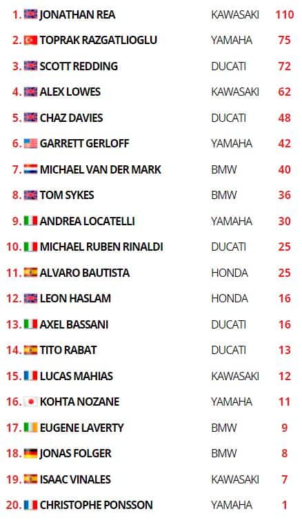 Alle spalle del bergamasco si piazzano Michael Van Der Mark e Alvaro Bautista, con le BMW di Sykes e Laverty davanti a Tito Rabat nelle prime dieci posizioni. Nuovamente a un passo dalla top-10 Axel Bassani, che replica l’undicesimo posto di Gara 1 portando a casa punti importanti e tanta esperienza. Il weekend opaco di Honda è confermato dalla dodicesima posizione di Leon Haslam, seguito da Kohta Nozane e da Redding, riuscito a ripartire artigliando un paio di punti. Zona punti per Lucas Mahias, appena davanti a Isaac Vinales. Ulteriore ritiro per Samuele Cavalieri.