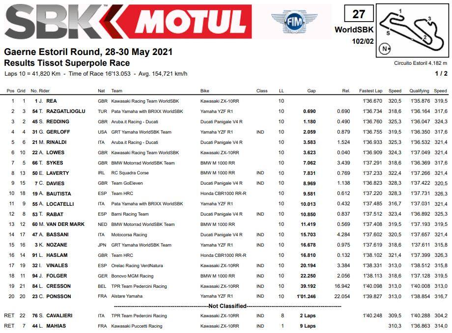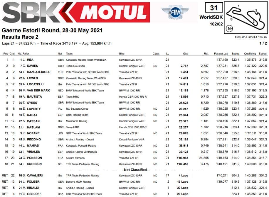 La corsa del pomeriggio parte con una serie di colpi di scena: Razgatlioglu anticipa la partenza e paga con un doppio long lap penalty, mentre al secondo giro Gerloff sbaglia la staccata in curva 6 e fa strike su Rinaldi. Dopo un inizio a rilento Rea torna sul leader di gara Redding, che nel corso della battaglia scivola e getta alle ortiche il podio. Per il pilota kawasaki si stende un tappeto rosso verso la vittoria, ottenuta davanti a Davies e Razgatlioglu. Quarta posizione per Lowes seguito da un ottimo Andrea Locatelli, alla prima top-5 del suo anno da rookie in SBK.