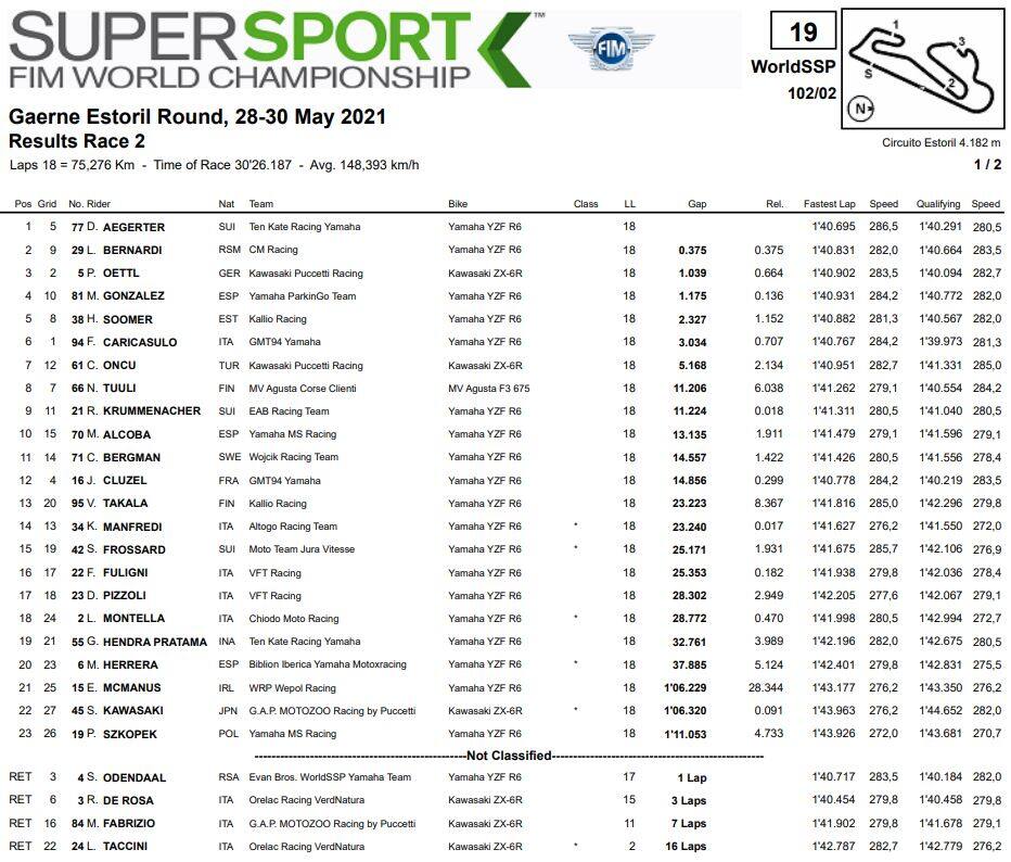 La prima vittoria in Supersport di Dominique Aegerter non poteva capitare in un momento più adatto: lo svizzero fa sua Gara 2 e dedica il successo al connazionale Jason Dupasquier, facendo risuonare l’inno elvetico all’Estoril. Aegerter lima a soli sei punti il distacco dalla testa della classifica in una gara a eliminazione che ha visto non solo le scivolate di Jules Cluzel (poi 12°) e Raffaele De Rosa, ma anche il ritiro per cause tecniche del leader del campionato Steven Odendaal.