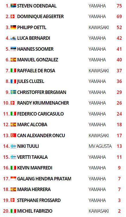 Alle spalle del vincitore si piazzano uno strepitoso Luca Bernardi e Philipp Oettl. Per il sammarinese del team CM Racing è il primo podio nella categoria, ottenuto alla quarta gara contro avversari dal palmares non indifferente. Le nuove leve sono rappresentate anche da Manuel Gonzalez, quarto con la Yamaha R6 di ParkinGo. In quinta posizione Hannes Soomer che precede Federico Caricasulo, a cui è mancato il ritmo per giocarsi il podio; dietro di lui, Can Oncu rimedia a un sabato disastroso con un buon settimo posto.