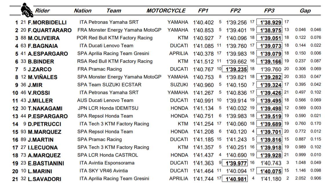 Tutti i primi sei della classifica hanno piazzato oggi il miglior tempo. Tra i Top 10 che si sono assicurati un posto in Q2 il solo a non aver migliorato è stato Zarco su Ducati Pramac, che ha fatto valere il suo 1'39''235 fatto segnare nelle Libere 2. Tanto equilibrio in pista, con i primi 5 racchiusi in appena un decimo e mezzo. Bene Pecco Bagnaia (quarto in 1'39''073), con l'altra Ducati di Miller fuori dalle Q2 per un soffio con l'11° crono. Ottimo il 10° tempo di Valentino Rossi (1'39''426), che proprio all'ultimo tentativo è riuscito a strappare il pass per il Q2. Dovranno lottare nel Q1 invece Petrucci, Marquez, Bastianini, Marini e Savadori.