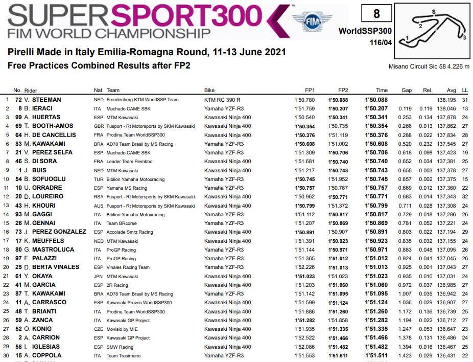 In Supersport 600 splende la stella di Manuel Gonzalez, alfiere del team italiano Yamaha ParkinGo: lo spagnolo si è imposto in entrambe le sessioni, con il miglior tempo di 1’38”473 messo a referto in FP2. Dietro di lui si piazzano i due leader della classifica, Steven Odendaal e Dominique Aegerter, mentre Niki Tuuli chiude quarto davanti alla velocissima wild card Roberto Mercandelli. Sesto crono per Federico Caricasulo seguito da Jules Cluzel e un’altra wild card, Filippo Fuligni.
