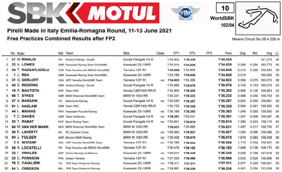 In quinta posizione troviamo Garrett Gerloff, con una Yamaha R1 sicuramente a suo agio tra le curve del circuito romagnolo. A seguito di un guasto in FP1 e di una bandiera nera con cerchio arancio non rispettata, Scott Redding ha dovuto saltare i primi venti minuti della sessione pomeridiana siglando poi il sesto tempo. Alle sue spalle Alvaro Bautista, Tom Sykes e un grande Axel Bassani sulla Ducati del team Motocorsa, con Leon Haslam a chiudere la top-10. Diciottesimo Andrea Locatelli, ventunesima posizione per Samuele Cavalieri.