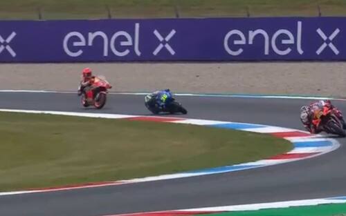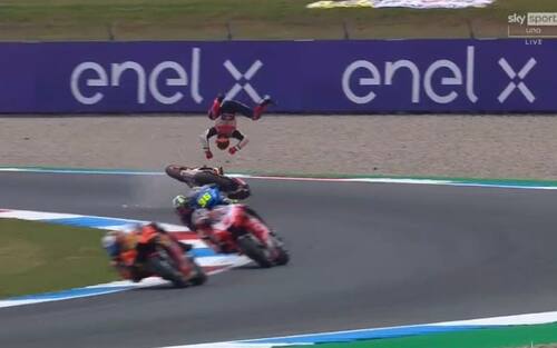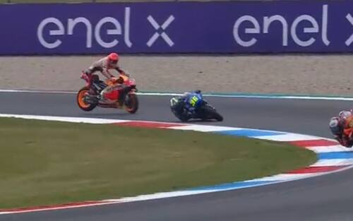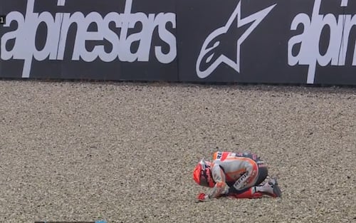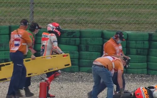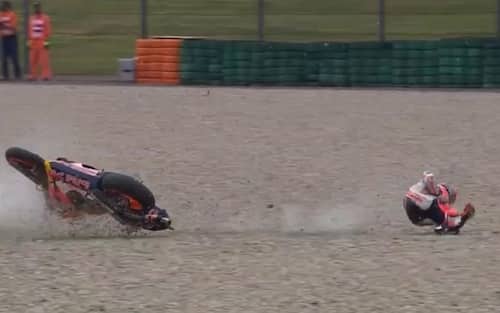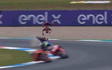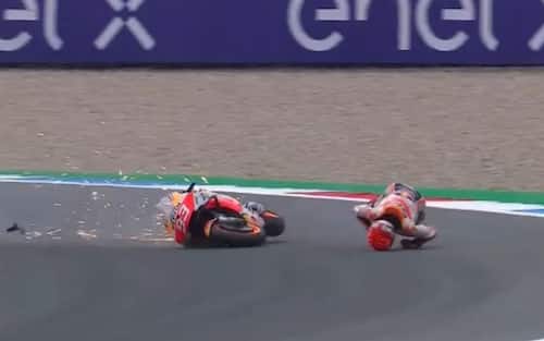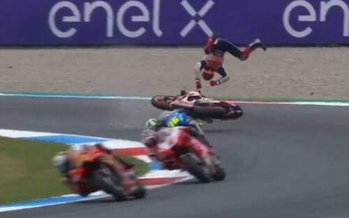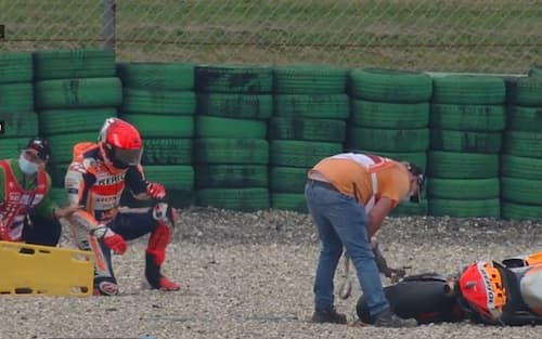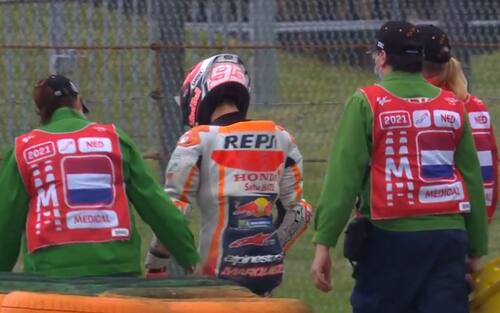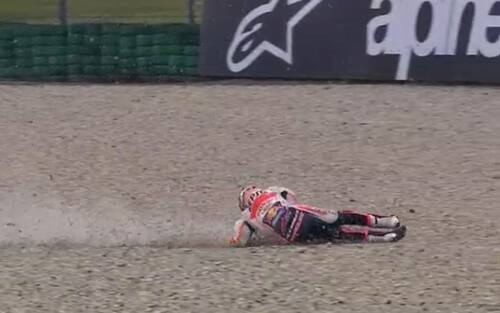 Impressionante caduta del pilota spagnolo della Honda, nelle Libere 2 di Assen: è stato letteralmente catapultato dalla sua moto alla fine della curva 10. Fortunatamente Marc si è rialzato dopo qualche attimo di tensione: visitato dal dott. Charte, il pilota ha un indolenzimento generale (più che altro a spalle, schiena e al braccio destro all'altezza del gomito) ma sta bene, è tutto ok