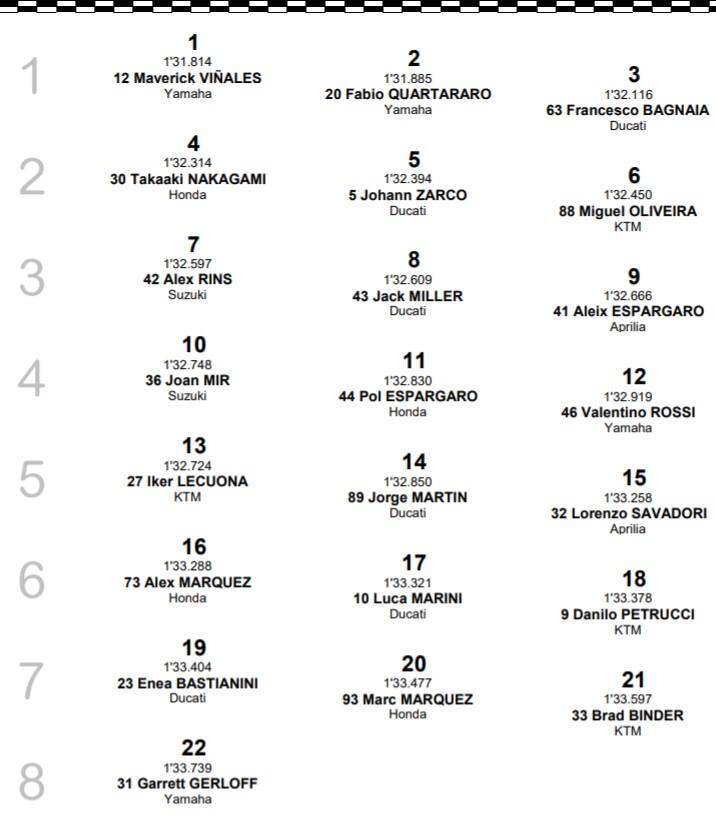 Straordinario Vinales ad Assen: conquista le pole, realizzando anche il nuovo record della pista in 1:31.814. Seconda casella per l'altra Yamaha ufficiale, quella di Quartararo. La Ducati di Bagnaia completa la prima fila. Marquez scatta dal 20° posto: eguaglia il suo peggior risultato in carriera, quando fu ugualmente 20° a Brno in 125cc nel 2009