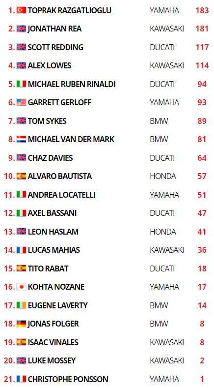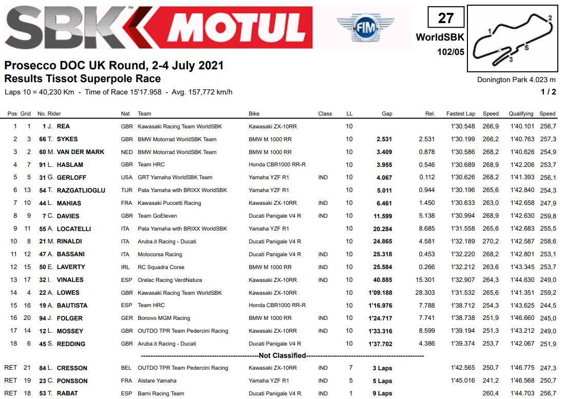 Razgatlioglu ha preceduto un veloce Garrett Gerloff, che ha artigliato quel podio sfumato in Gara 1 replicando il suo miglior risultato in carriera. Sul podio anche Sykes, capace di tenere dietro un Redding più veloce di lui negli ultimi giri. Van Der Mark ha piazzato la seconda BMW in top-5 battendo Alex Lowes (caduto in Superpole Race mentre era secondo). Settima posizione per Chaz Davies davanti all’altro ducatista Michael Ruben Rinaldi, mentre le due Honda ufficiali di Leon Haslam e Alvaro Bautista hanno concluso al nono e decimo posto; lo spagnolo ha beffato proprio all’ultimo momento Andrea Locatelli. A punti anche Lucas Mahias, Axel Bassani, Tito Rabat ed Eugene Laverty.