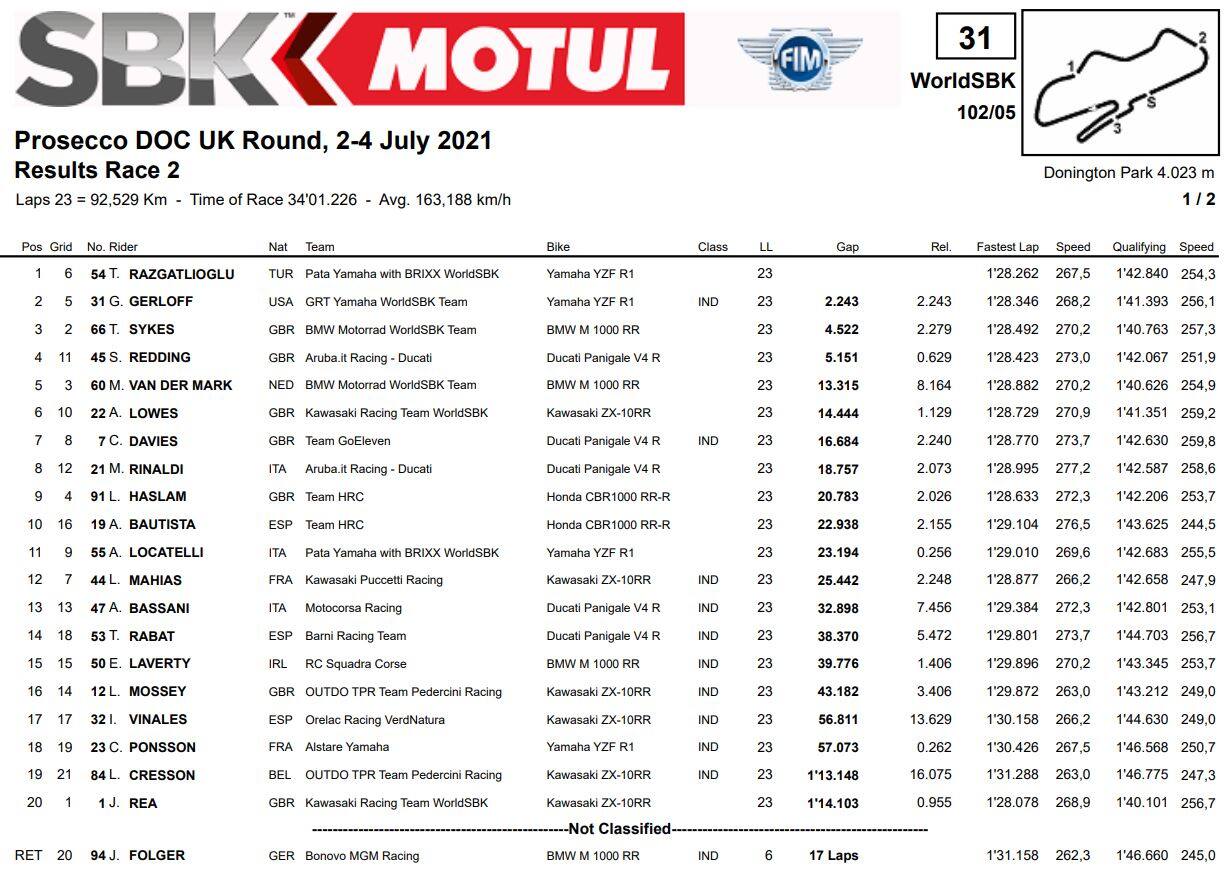 Nella sprint i piloti erano partiti tutti con gomma intermedia ad eccezione di Scott Redding, terminato diciottesimo a causa della scelta di montare la rain su una pista ormai quasi asciutta. Al contrario, nonostante qualche goccia minacciosa nel pre-gara, in Gara 2 si è corso con gomme slick e tutti hanno potuto spingere al massimo fin da subito. Rea e Razgatlioglu hanno comandato la corsa scambiandosi un paio di volte la posizione, seguiti a distanza crescente da Sykes. All’undicesimo giro Rea ha perso l’anteriore sulle sconnessioni della curva Coppice, lasciando la vittoria nelle mani del turco. Il campione del mondo è poi ripartito, chiudendo ventesimo.