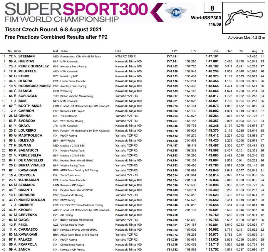 Come ad Assen, anche a Most è Victor Steeman a comandare le prove della Supersport 300, con il solo turno del mattino a fare fede prima della pioggia pomeridiana. L’olandese ha girato in 1’47”191 rifilando mezzo secondo ad Adrian Huertas, con José Luis Perez Gonzalez a nove decimi. In contumacia dell’appiedato Bruno Ieraci, il più rapido tra gli italiani è stato Mirko Gennai tredicesimo, mentre anche Gabriele Mastroluca (17°) e Kevin Sabatucci (20°) sono in top-20.