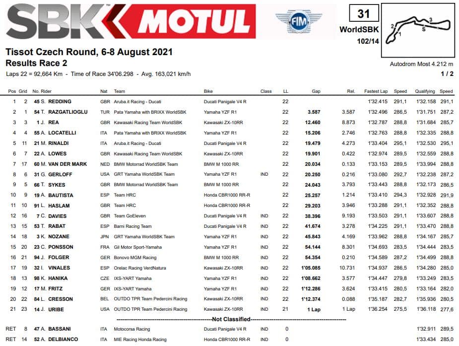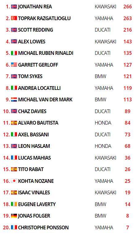 Anche Redding ne approfitta per passare Rea, chiudendo secondo e replicando il risultato di ieri. Il campione in carica ottiene il tanto agognato duecentesimo podio in carriera, festeggiato a denti un po’ stretti. Alle sue spalle si classifica un ottimo Andrea Locatelli seguito da Tom Sykes e Garrett Gerloff; tra i primi nove anche Alex Lowes, Axel Bassani e Alvaro Bautista che beffa Michael Rinaldi (10°). Caduto Alessandro Delbianco.