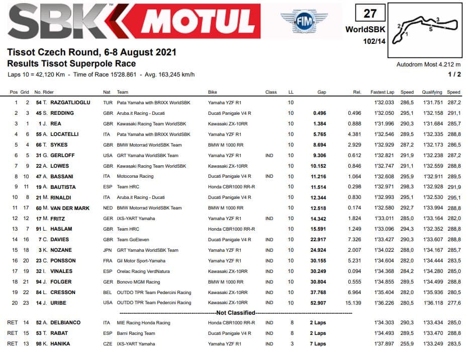 Il fine settimana di Most si chiude nel segno di Toprak Razgatlioglu e Scott Redding, che si spartiscono le vittorie della domenica. A inaugurare la giornata è il turco con il successo in Superpole Race, il decimo della sua carriera in Superbike ottenuto alla centesima partenza. Fin dallo start Toprak prende la testa davanti a Jonathan Rea, che a tre giri dal termine commette un errore alla prima curva e gli lasci campo libero verso il trionfo e la pole position per Gara 2.