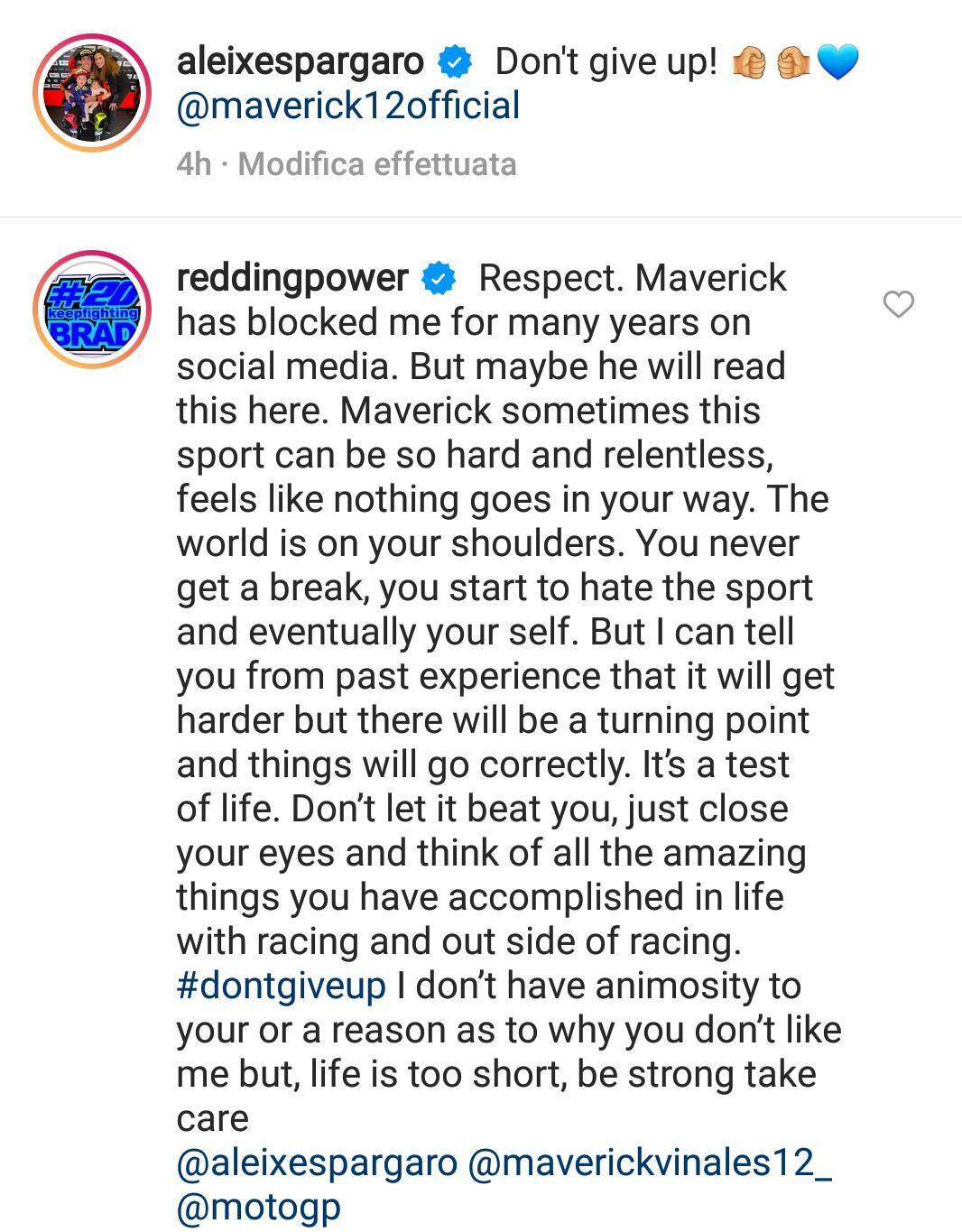 Più lungo il messaggio sui social di Redding, ex pilota MotoGP che adesso corre in Superbike. Scott, rispondendo proprio al messaggio di Aleix Espargaró, ha scritto: "Rispetto per Vinales. Maverick mi ha bloccato sui social da tanti anni, ma forse riuscirà a leggere qui questo messaggio. Maverick, a volte questo sport può essere così duro e difficile da affrontare, sembra che niente vada dalla parte giusta. Ti ritrovi il mondo sulle tue spalle. Non hai mai un attimo di riposo, inizi a odiare lo sport e alla fine inizi a odiare anche te stesso. Ma posso dirti per esperienza personale che, per quanto possa diventare ancora più dura di così, ci sarà un punto di svolta e le cose andranno per il verso giusto. È una prova di vita. Non lasciarti abbattere, chiudi gli occhi e pensa a tutte le cose incredibili che hai realizzato nella vita con le corse e al di fuori delle corse. Non arrenderti. Non ho rancore nei tuoi confronti e non capisco per quale motivo dovresti avercela con me, ma la vita è troppo breve, quindi sii forte e abbi cura di te".