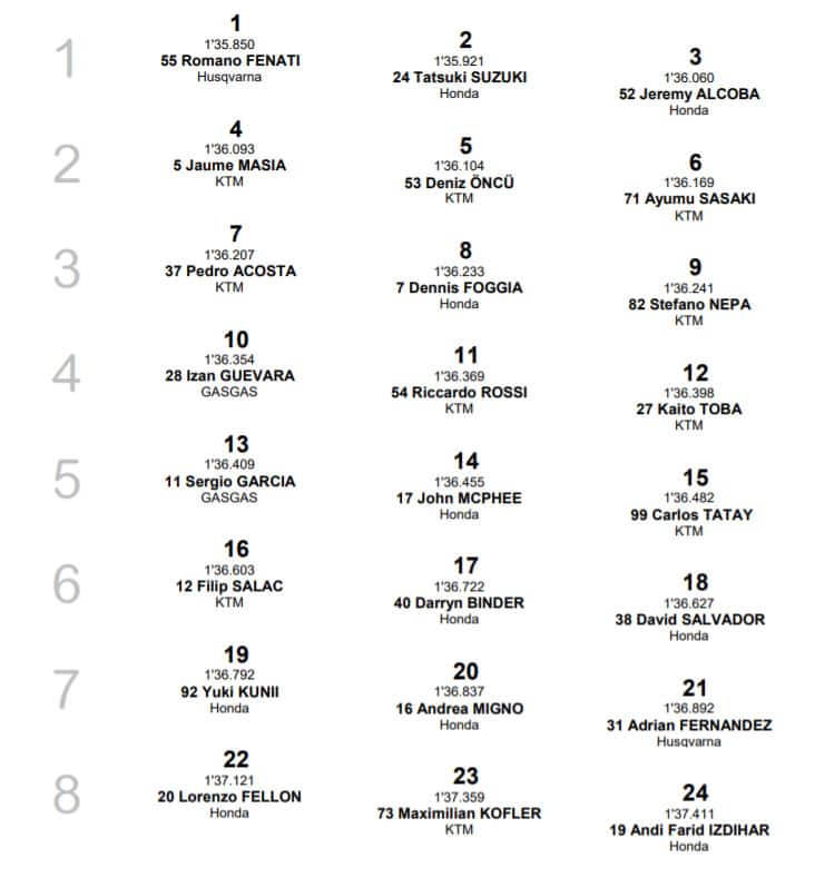 Andrea Migno partirà invece 17°. Il romagnolo non ha superato lo scoglio della Q1. Non è riuscito a sfruttare la gomma nuova a causa di una scivolata davanti a lui con conseguente bandiera gialla che gli ha cancellato il giro buono. Quello dopo il romagnolo ha sbagliato tutto. Scatterà invece dall’ultima fila, col 25° tempo, Elia Bartolini chiamato a sostituire l’infortunato Niccolò Antonelli.