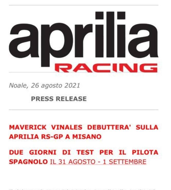 Maverick Vinales pronto alla sua nuova avventura con l'Aprilia. Dopo la separazione da Yamaha con effetto immediato, il pilota spagnolo sarà in sella alla RS-GP per una due giorni di test - 31 agosto e 1° settembre - sul tracciato di Misano Adriatico. "Inizia il percorso d'inserimento di Maverick nella nuova struttura che lo accompagnerà per tutto il 2022 - si legge nel comunicato Aprilia - un avvicinamento graduale al miglior affiatamento, essenziale in un campionato straordinario come la moderna MotoGP".