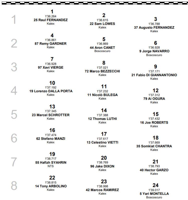 Gli altri italiani: 16° Stefano Manzi che ha fatto un passo indietro rispetto alle prove, 17° Celestino Vietti che fatica a trovare il feeling con la nuova categoria, 22° Tony Arbolino, ripiombato nelle zone basse dello schieramento, 24° Yari Montella, 25° Simone Corsi, 29° Lorenzo Baldassarri. Nel complesso non una gran qualifica per gli italiani.
