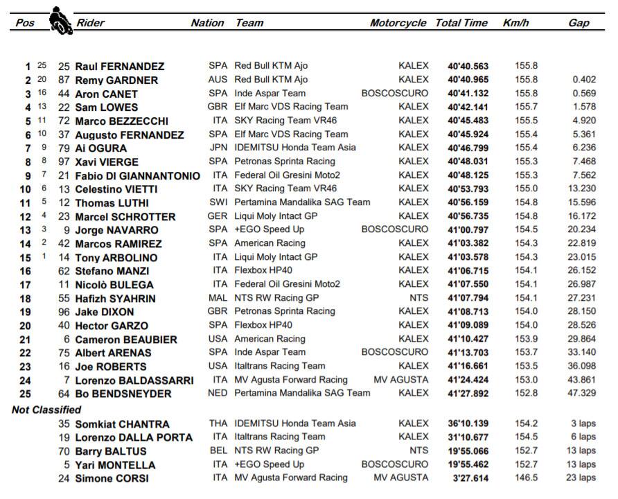 Canet si è fatto sotto a Raul Fernandez nel frattempo passato al comando, mentre Gardner guadagnava metri su di lui. A tre giri dal termini Fernandez ha cercato lo strappo e il giro dopo l’australiano ha passato il piota di Aspar. Gara finita? Tutt’altro in un giro Gardner ha mangiato il secondo di vantaggio che Fernandez s’era messo da parte per il finale. Al curvone Remy ha tentato un sorpasso impossibile, perdendo per un attimo l‘anteriore e rischiando di sprecare tutto, riaprendo il duello con Canet negli ultimi metri. Fine della storia e della cronaca di una gara abbastanza avara fin lì d’emozioni. Fernandez ha tagliato per primo davanti al compagno di squadra a cui ha mangiato cinque preziosi punti in classifica e portandosi a meno 34.