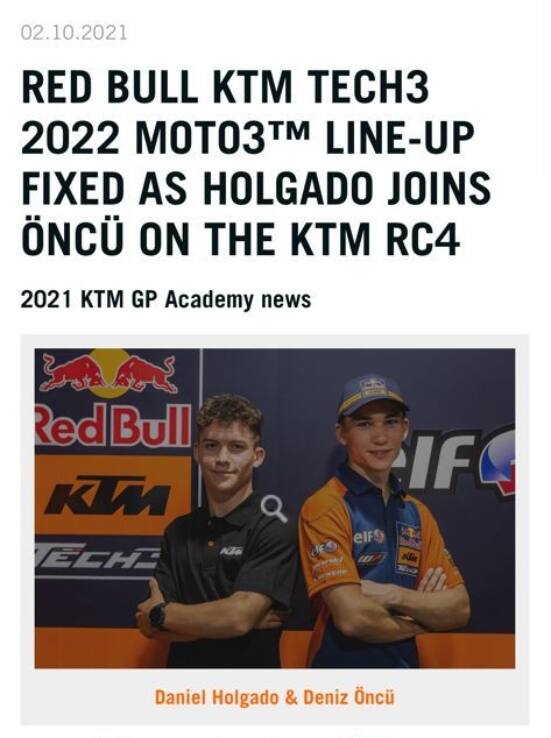KTM Tech3 ha ufficializzato i piloti per la prossima stagione della Moto3. Il team si rinnova per metà, puntando su esperienza e novità: il 18enne turco Deniz Öncü è la conferma, con lui ci sarà lo spagnolo Daniel Holgado, 16 anni, impegnato nel CEV Moto3, e che ha già avuto un'esperienza nel Mondiale come sostituto in Catalunya.