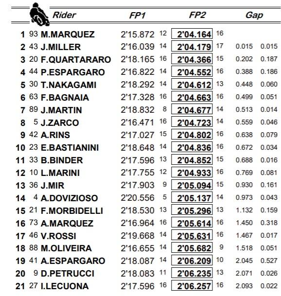 Miller è stato il ducatista più efficace e ha domato la potenza della moto inanellando una serie di giri veloci. Yamaha ancora un po' in difficoltà sulla pista che andava asciugandosi, si è ritrovata nella seconda sessione con Quartararo, che ha definito le buche alle curva 10 molto pericolose. Il francese inoltre continua a dichiarare di voler andare all’attacco senza pensare al vantaggio mondiale. Pecco Bagnaia sembra abbia ancora necessità di lavorare nella ricerca dell’assetto ottimale, anche se ha un passo gara interessante. In Suzuki Rins è nei nei dieci, mentre Mir ne è fuori non estremamente soddisfatto. Verso la fine della FP2 abbiamo vissuto la zampata di Dovizioso e Morbidelli, entrati provvisoriamente nei dieci, che hanno chiuso comunque a ridosso della zona nobile. Due "lampi" che per motivi diversi fanno ben sperare per il futuro. Nei dieci della combinata oltre a Marc Marquez, Miller e Quartararo abbiamo Pol Espargararo' e Nakagami, a testimonianza che la Honda va bene in Texas, che precedono Bagnaia, Martin, Zarco, Rins e Bastianini.