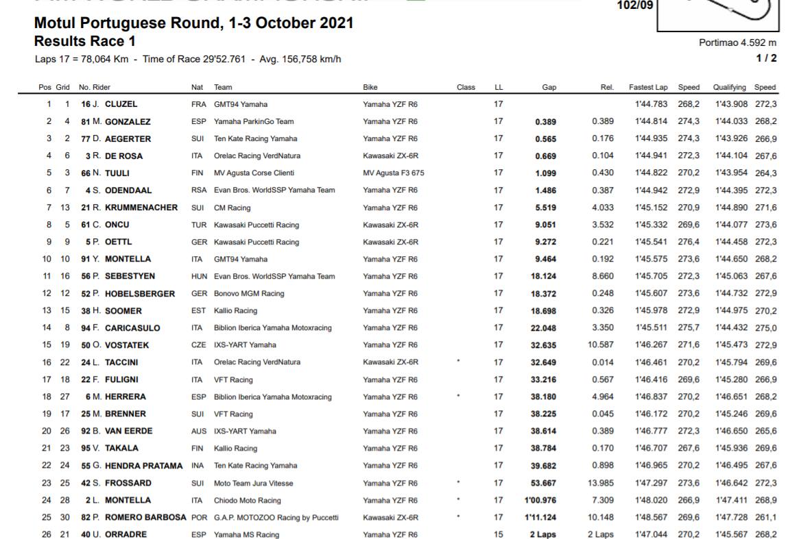 A Portimao Jules Cluzel scatta dalla pole e conquista Gara 1, siglando la ventunesima vittoria in carriera nonché la prima della stagione. Il francese di GMT94 ha condotto una gara intelligente e ha saputo respingere gli attacchi di un arrembante Manuel Gonzalez relegandolo al secondo posto. A podio anche Dominique Aegerter, che fa terzo e amplia il suo margine di vantaggio in classifica su Steven Odendaal (6°).