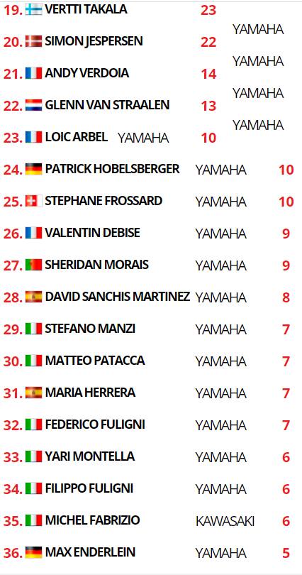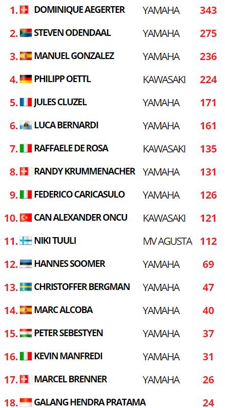 Il sudafricano di Evan Bros è in fase calante da qualche gara e con sessantotto lunghezze di distacco le sue chances di titolo si fanno quasi nulle. Quarto posto per Raffaele De Rosa davanti a Niki Tuuli, con Odendaal appena dietro. Settimo posto per Randy Krummenacher, in top-10 le Kawasaki Puccetti di Can Oncu e Philipp Oettl come anche Yari Montella al debutto. Prestazione amara per Federico Caricasulo, solo quattordicesimo.