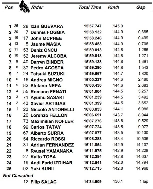 L’incidente è stato spaventoso, i due piloti sono letteralmente volati in aria, mentre altri piloti arrivavano col rischio di colpire Alcoba rimasto sull’asfalto. Nessuno s’è fatto nulla, tutti i piloti coinvolti sono tornati al box sulle proprie gambe, incolumi ma scossi. Andrea Migno non ha trattenuto il suo sfogo: “Poteva essere una caduta mortale come a Jerez. Sono già morti tre piloti, cos’altro deve succedere prima che si prendano provvedimenti”. Andrea ha fatto capire che solo il caso ha impedito un epilogo peggiore. “Di manovre così ne succedono una valanga a ogni gara, speriamo che questo episodio spinga chi di dovere a cambiare qualcosa”. Passato lo spavento, restava da capire come concludere la corsa. La gara era stata accorciata dopo il primo incidente causato dalla caduta di Filip Salac portato via in barella. Al momento della prima interruzione Dennis Foggia scattato male al primo via era riuscito a rimontare fino al secondo posto mentre Pedro Acosta navigava più indietro. Guevara, tagliato fuori subito dopo il secondo via per problemi tecnici, è stato riammesso in classifica perché la direzione gara ha infine deciso di cancellare il secondo spezzone di gara. Classifica congelata quindi alla prima frazione. Il pilota del Team Aspar ha così potuto festeggiare una vittoria insperata. Contento anche Dennis Foggia che con il secondo posto ha recuperato dodici punti sul leader del mondiale Acosta, finito in ottava posizione. Mondiale riaperto a tre gare dalla fine con 75 punti in palio e trenta di differenza tra lui e il pilota romano.