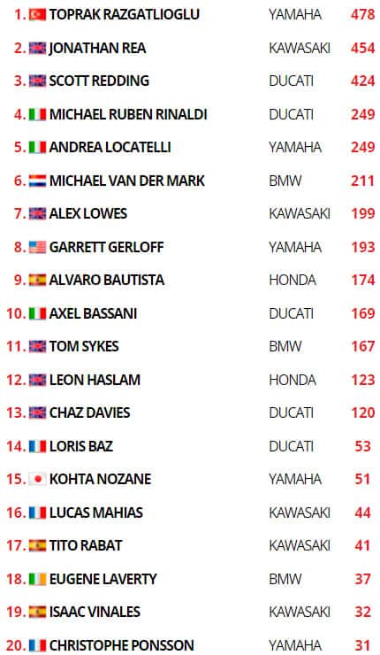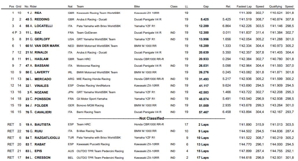 Nei primi giri di Gara 2 si è ripetuta la battaglia che aveva aperto la corsa di sabato, con i tre moschettieri del mondiale a scambiarsi le posizioni fino alla caduta di Razgatlioglu avvenuta al decimo giro: alla curva quindici un pezzo del parafango della sua Yamaha R1 si è rotto, causando una scivolata ad alta velocità, ma senza conseguenze. Rea ha dunque imposto il suo ritmo in solitaria, con Redding soddisfatto del secondo posto.