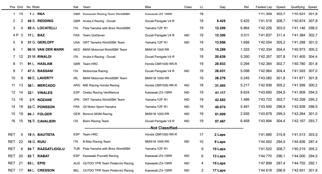 Un contatto all’ultimo giro tra Baz e Bautista ha provocato la caduta dello spagnolo, lasciando al transalpino strada libera per il terzo podio consecutivo. Loris Baz viene poi penalizzato di una posizione per il contatto all'ultimo giro, che ha causato la caduta dello spagnolo. Andrea Locatelli eredita la terza posizione in Gara 2, con Gerloff quinto davanti al vincitore della Superpole Race, Van Der Mark. Un Rinaldi non al cento per cento dopo il volo di stamattina chiude settimo, in top-10 anche Haslam, Bassani e Laverty. Sedicesimo Cavalieri, ritirato Ruiu.