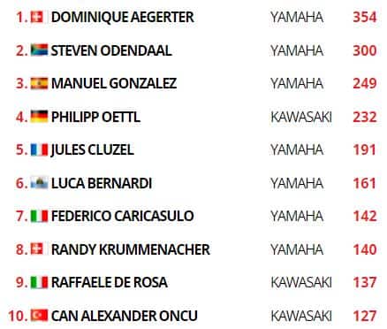 L’italiano tiene dietro Manuel Gonzalez, mentre più distanti giungono Dominique Aegerter e il debuttante Yari Montella. Settima piazza per Randy Krummenacher, con la top-10 completata da Philipp Oettl, Peter Sebestyen e Can Oncu. Kevin Manfredi si aggiudica il titolo Challenge europeo chiudendo undicesimo in gara, a punti anche Raffaele De Rosa (14°) dopo essere scivolato mentre era nel gruppo di testa. Caduto Niki Tuuli.