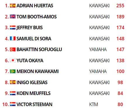 In Supersport 300 trionfa Adrian Huertas, che festeggia nel migliore dei modi la vittoria del titolo avvenuta ieri. Lo spagnolo scappa in fuga negli ultimi giri e lascia sul posto Tom Booth-Amos e Bahattin Sofuoglu. L’inglese capitalizza sulla caduta di Jeffrey Buis per conquistare il secondo posto nel mondiale. Giù dal podio Inigo Iglesias e Yuta Okaya, a punti Mirko Gennai (9°), Bruno Ieraci (11°), Gabriele Mastroluca (12°) e Kevin Sabatucci (13°).