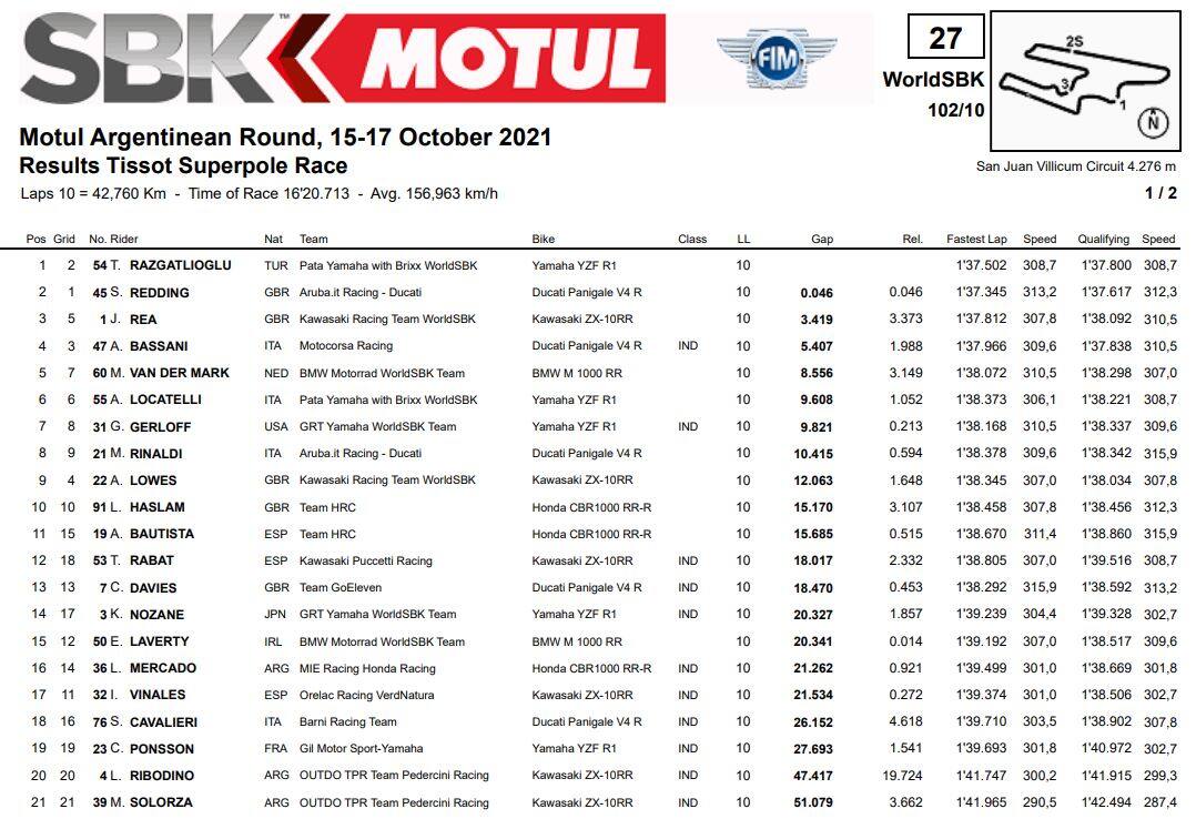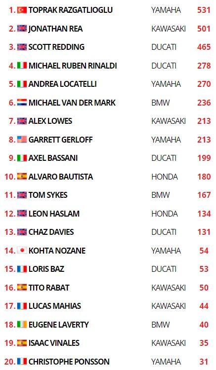 SBKRazgatlioglu vince la gara sprint, ma non va oltre il terzo posto in Gara 2. Un sontuoso Redding si aggiudica la corsa, Rea secondo e si porta a -30 punti dal leader del mondiale Razgatlioglu. Il turco chiude 3°. Si deciderà tutto in Indonesia, ultimo atto della stagione