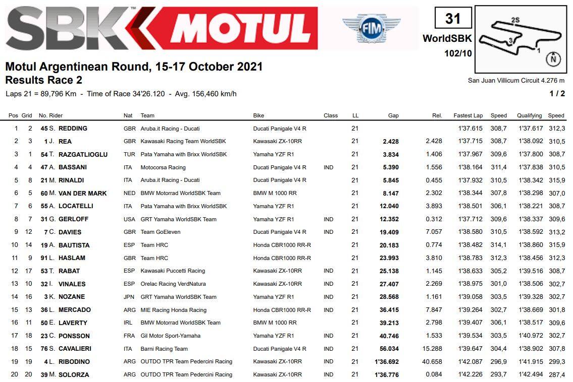 Gara 2 ha visto l’esplosione di una furiosa battaglia tra Razgatlioglu, Redding, Rea e a tratti Bassani. Nella prima metà di gara si sono susseguiti sorpassi e controsorpassi, poi l’inglese ha rotto gli indugi prendendo la testa e scappando in fuga a suon di giri sotto il 1’38”. Una prova di forza che ha lasciato Rea e Razgatlioglu a giocarsi la seconda posizione, con il nordirlandese che ha trovato la velocità per spuntarla sul pilota Yamaha. Tra i due ora ballano trenta punti in classifica, col solo round di Mandalika ancora da disputare.