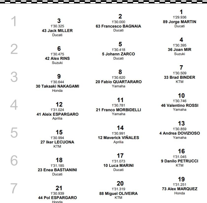 Ci sono 5 Ducati nelle prime 4 posizioni in griglia: il poleman è Martin, seguito da Bagnaia e Miller. Mir in quarta casella, davanti alla Desmosedici di Zarco. Per Pecco decima prima fila consecutiva: eguaglia la sequenza record per un pilota Ducati, messa a segno da Stoner nel 2008. Il campione del mondo Quartararo scatta 8°, mentre Rossi parte 10° nell'ultimo GP della sua carriera