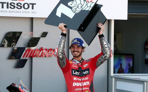 CHE SPETTACOLO. Bagnaia, considerato da molti il successore di Valentino in MotoGP, vince il GP Valencia davanti a Martin e Miller. Pecco trionfa indossando un casco dedicato a Valentino, con la scritta "Che spettacolo" resa celebre anni fa proprio da Rossi: "Potevo solo vincere con questo casco", dichiara il pilota Ducati