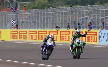 Raffaele De Rosa trionfa in una caotica Gara 1 di Supersport in Indonesia, centrando la prima vittoria nella categoria dopo una rincorsa durata ottantanove gare. Il pilota del team Orelac è stato il più bravo a gestire le mutevoli condizioni della pista, bagnata da uno scroscio di pioggia nei primi giri e poi asciugatasi rapidamente. Quando i tempi sono tornati ad abbassarsi, infatti, De Rosa ha preso margine sugli inseguitori insieme a Federico Caricasulo; quel gap gli ha permesso di difendersi dal rientro di Dominique Aegerter all’ultimo giro.