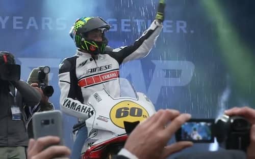 Rossi è arrivato sul palco in sella a una Yamaha con una speciale livrea per celebrare i 60 anni dal debutto nelle corse della Casa giapponese