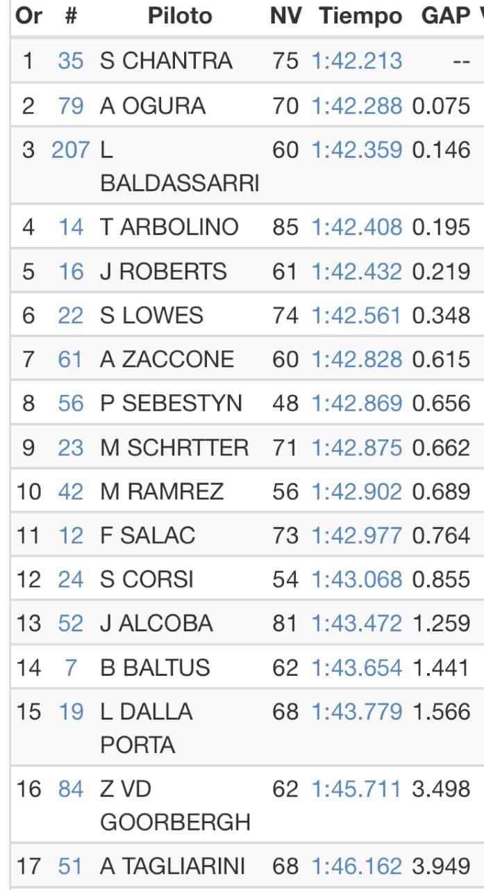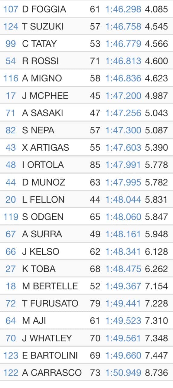 Un po’ più indietro Alberto Surra e i debuttanti Bertelle e Bartolini, l’anno scorso rivali per il titolo nel Civ Moto3 e adesso compagni di squadra nel team Avintia. Ma stanno prendendo le misure alla moto e al Mondiale. Bartolini, in particolare, ha anche avuto qualche piccolo intoppo tecnico e ha girato solo con hard usata senza toccare la moto per ritrovare la sensazione di velocità dopo la lunga sosta. Era atteso anche il rientro in Moto3 di Ana Carrasco, già campionessa del mondo Supersport 300, che ha chiuso la prima giornata in fondo alla lista dei tempi.