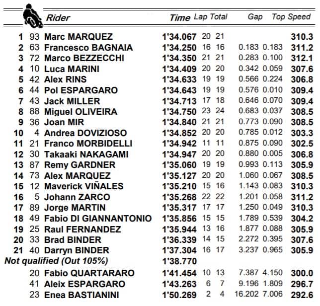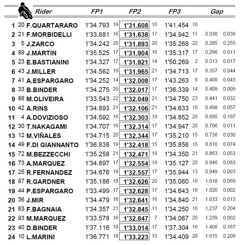 Assisteremo quindi a un Q1 pieno di campioni: Pecco Bagnaia, nonostante il secondo posto nelle Libere 3, è soltanto 21° nella combinata e pertanto dovrà passare dal Q1 proprio come altri top rider (Mir, Vinales, Pol Espargaró, Dovizioso). In testa alla combinata restano Quartararo e Morbidelli. Insieme ai due piloti ufficiali Yamaha, questi sono i nomi che accedono al Q2: Zarco, Martin, Bastianini, Miller, Aleix Espargaró, Brad Binder, Oliveira, Rins.