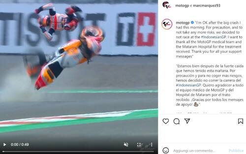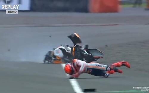 Marquez è stato protagonista di una terribile caduta durante il warm up del GP Indonesia: è stato sbalzato in aria dalla sua Honda, battendo forte la testa dopo una rotazione in aria. Per lui un trauma cranico e varie contusioni, è stato dichiarato unfit e non ha potuto prendere parte al GP Indonesia. "Sto bene, ho deciso di non gareggiare per precauzione, per non correre ulteriori rischi", spiega lo spagnolo sui social. Lunedì 21 svolgerà ulteriori accertamenti a Barcellona