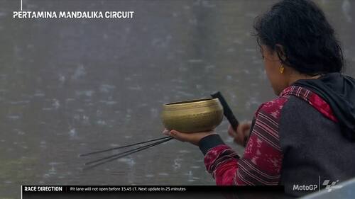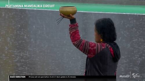 Un vero e proprio nubifragio si è abbattuto su Mandalika, pochi minuti prima del via della gara di MotoGP, inizialmente prevista per le 8 italiane e poi posticipata alle 9.15. Da non credere sia le immagini del fulmine che si è abbattuto sul circuito, che quelle di una donna locale che è riuscita a scacciare la pioggia torrenziale con un 'rito magico'... e ce l'ha fatta!