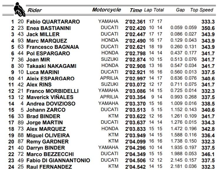 libere 3Quartararo è il più veloce nelle Libere 3 di Austin. Il francese chiude in testa anche nella combinata, con due Ducati a ridosso: 2° Bastianini a 59 millesimi, 3° Miller a +0.086. Marc Marquez conferma di avere recuperato la giusta forma con il 4° tempo. Bene Bagnaia 6° nella combinata, a sorpresa anche Marini accede al Q2 con il 10° posto. Le due Aprilia, Morbidelli e Dovizioso costretti a passare dal Q1. Le qualifiche alle 21:10 in diretta su Sky Sport MotoGP