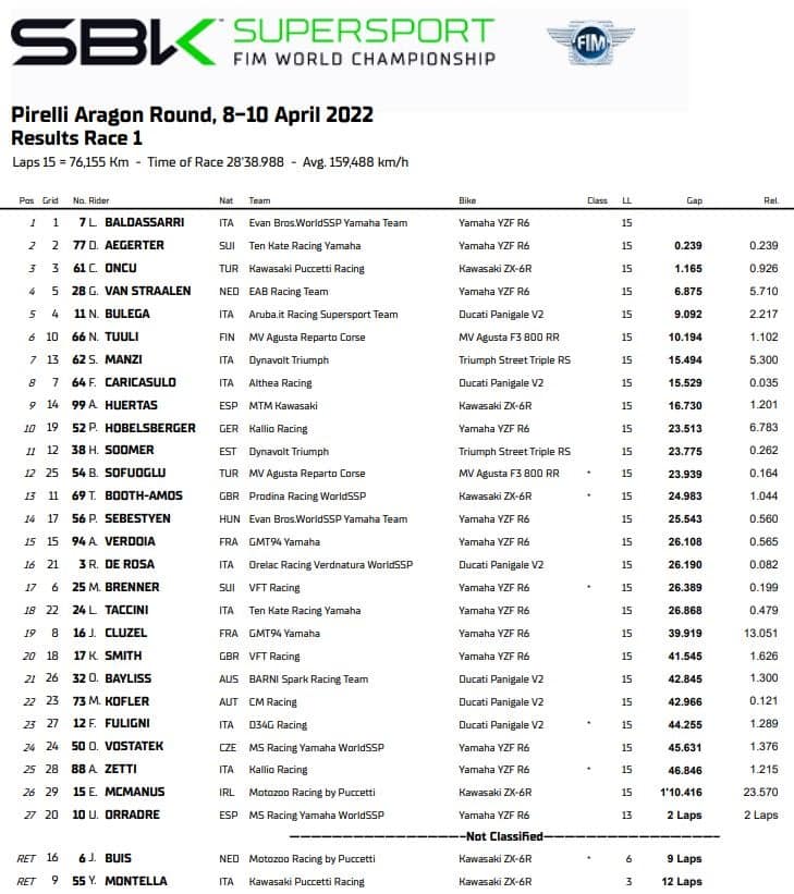 L’epilogo è stato da film: Baldassarri ha perso l’anteriore all’ultima curva e si è salvato per miracolo da una caduta, strisciando a lungo sull’asfalto; Aegerter è rimasto coinvolto venendo a contatto con la moto del rivale, ma è rimasto anche lui in piedi andando lungo. Alla fine l’ha spuntata proprio “Balda”, che consegna a Yamaha la prima vittoria della nuova era della Supersport. Secondo Aegerter, terzo e più staccato Oncu.