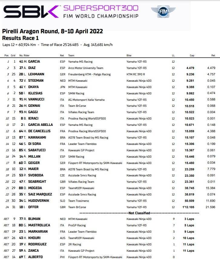 In Supersport 300 è monologo di Marc Garcia, autore della pole e poi di una fuga inarrestabile verso la vittoria. Al secondo posto chiude Alvaro Diaz, solitario a sua volta mentre il gruppo si contendeva la terza piazza: a spuntarla è stato Lennox Lehmann al termine di una rimonta di ben ventidue posizioni. Il tedesco ha beffato Victor Steeman, Yuta Okaya e Inigo Iglesias, mentre la coda del gruppo parla italiano e vede Matteo Vannucci settimo davanti a Mirko Gennai, Marco Gaggi e Bruno Ieraci. A punti Kevin Sabatucci, quindicesimo.