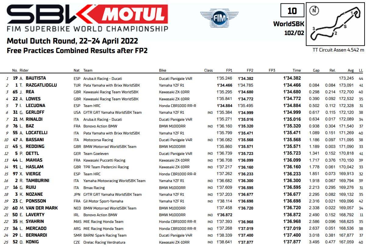 Alvaro Bautista parte forte nel round Superbike di Assen, chiudendo al primo posto la giornata di prove libere con il tempo di 1’34”382 siglato nella seconda sessione. Il pilota Ducati si è dimostrato molto solido sul passo gara e sembra il favorito insieme a Toprak Razgatlioglu su Yamaha, primo al mattino e secondo nel combinato con un ritmo convincente. Pare leggermente meno a suo agio Jonathan Rea, che chiude terzo con particolari difficoltà nel quarto settore del tracciato, dove la sua Kawasaki fatica ad affrontare l’ultima chicane. Alle spalle dei Tre Moschettieri spunta Alex Lowes, quarto davanti a un Iker Lecuona molto determinato: lo spagnolo di casa Honda ha concluso al secondo posto la FP1 e ha completato la FP2 nonostante un brutto highside nelle prime fasi. Sesto crono per Garrett Gerloff, con Michael Rinaldi settimo e Loriz Baz ottavo. Andrea Locatelli e Axel Bassani si confermano in top-10, mentre Roberto Tamburini è sedicesimo e precede Gabriele Ruiu. Ventiquattresimo Luca Bernardi.